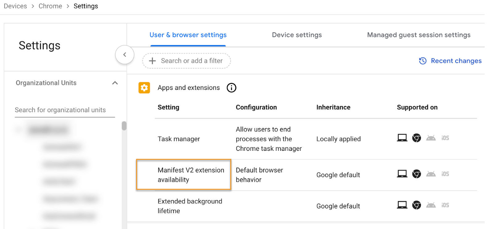 Select the policy Manifest V2 extension availability.