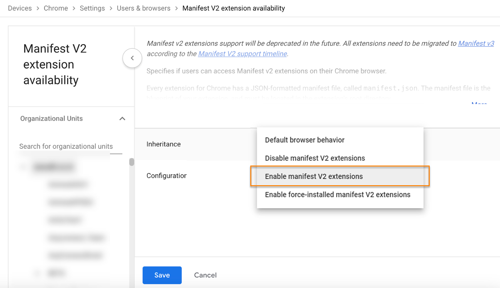 Select Enable manifest V2 extensions from the default browser behavior dropdown.