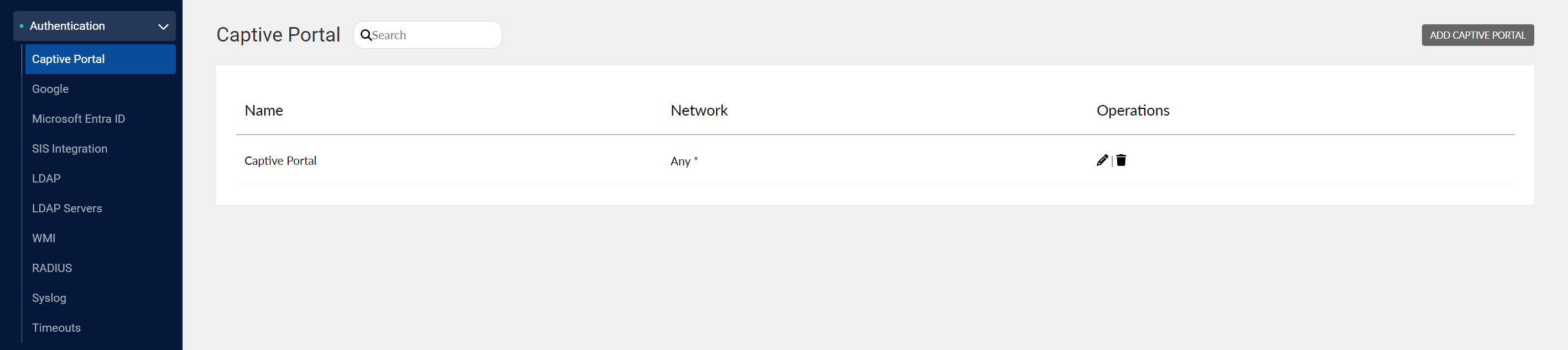 The Authentication page allows administrators to set up authentication methods, such as Captive portal, Google, Microsoft Entra ID, and LDAP. Administrators can also use these methods to import users and groups from third-party databases.