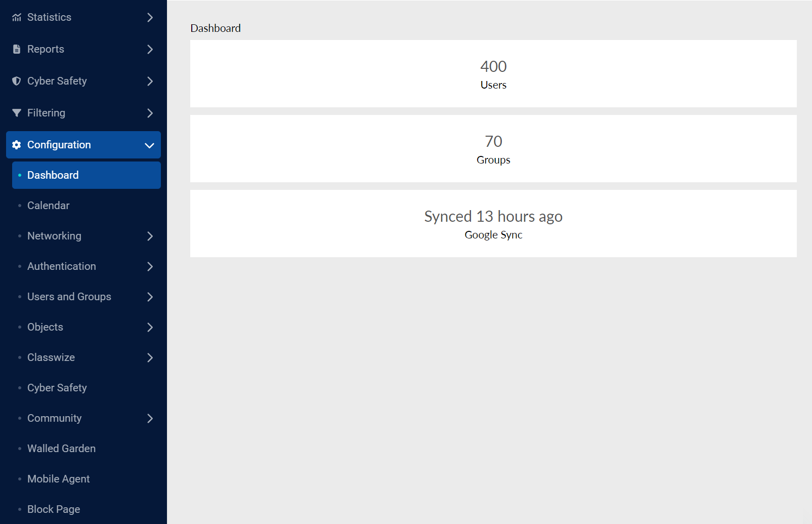 The Dashboard page shows key summaries, including the total number of users, groups, classrooms and synchronizations. Selecting a summary box (Users, Groups, Classrooms or Authentication) opens its detailed report page.