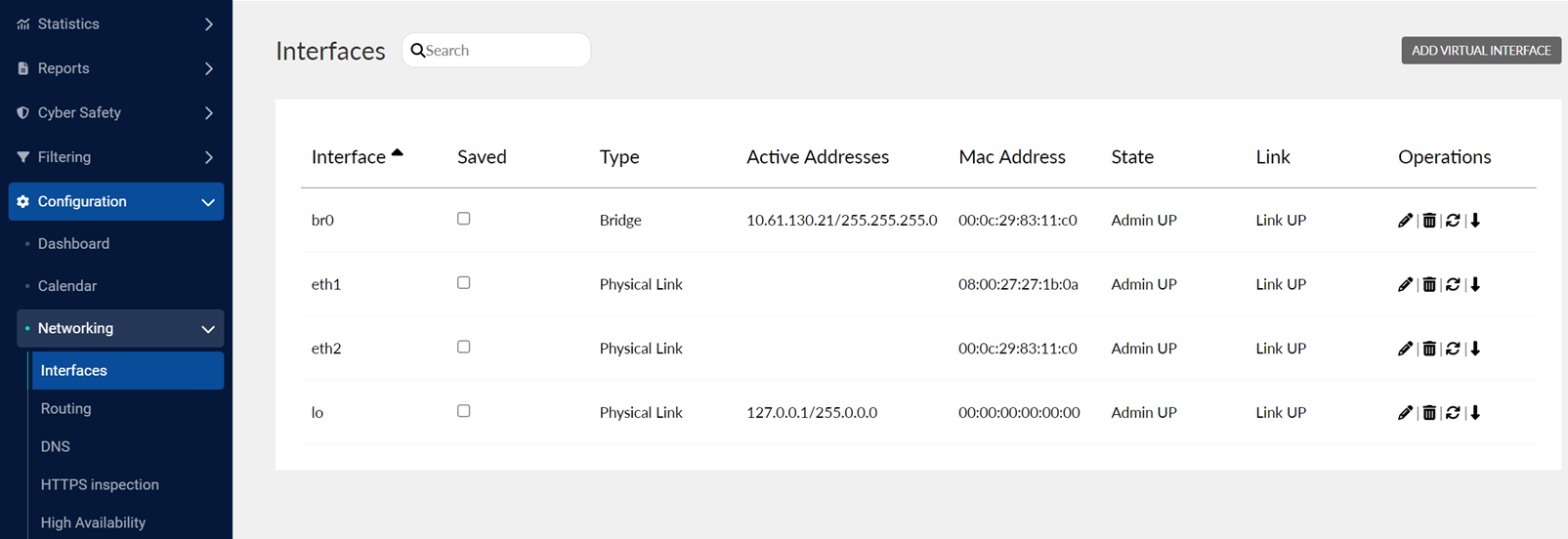 The Networking page displays the list of all connections made through the network, including virtual connections, routing, DNS, and high-availability features. These items ensure Linewize Filter continues to run in case of a failure in one device.