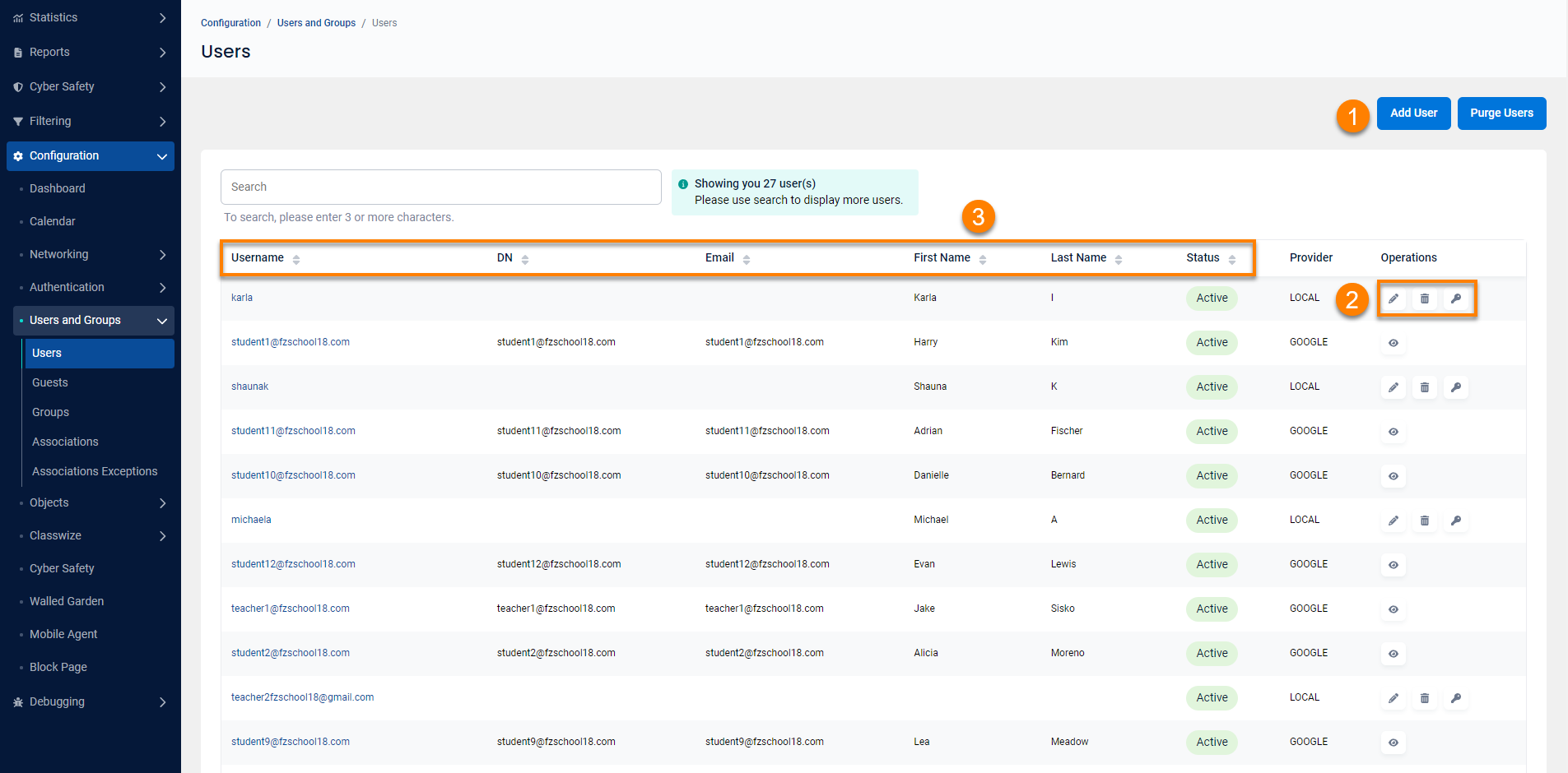 Configuration of users, groups, guests, classrooms is completed in the Users and Groups section.