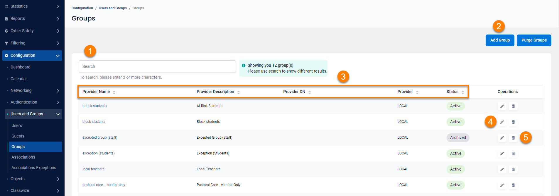 Groups make it easy for administrators to create filtering rules, assign classrooms, and configure other Linewize Filter features for multiple users with similar requirements, usage, or profiles.