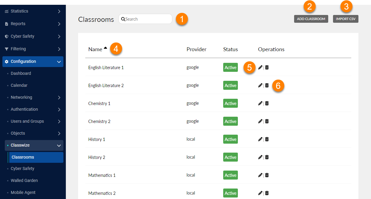 - To configure a classroom, select its Edit icon or its name, and then update the classroom's details in the Manage Classroom form.