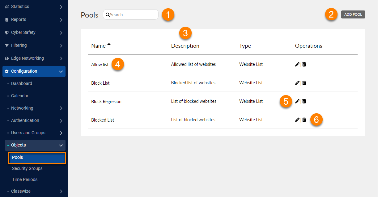 Pools allow administrators to create related filters and rules (for example, allow social media sites or an IP range). The page displays all available pools in the system and can be sorted by column heading.