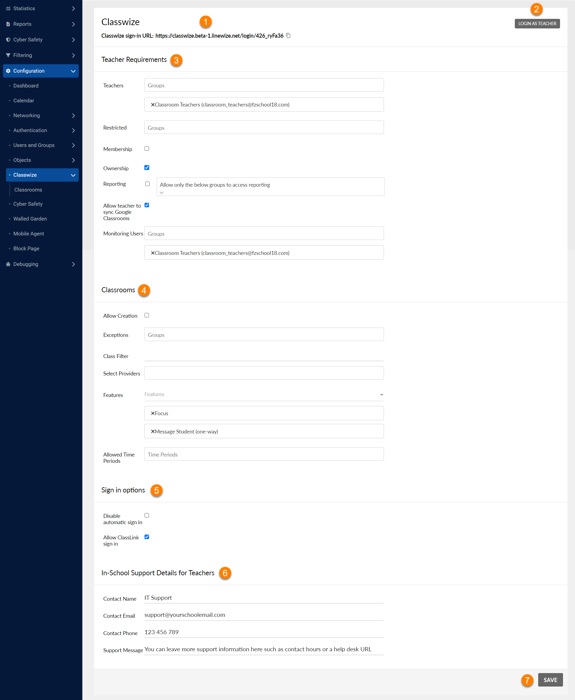 Teachers, classrooms, sign-in options, chatbot, and in-school technical support are configured in the Classwize page.