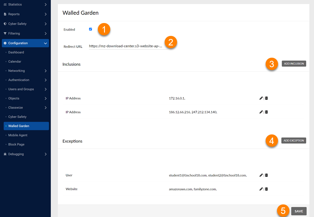 - Select Add Exception if there are users, sites, content, groups, or network details that will be excluded from the walled garden.