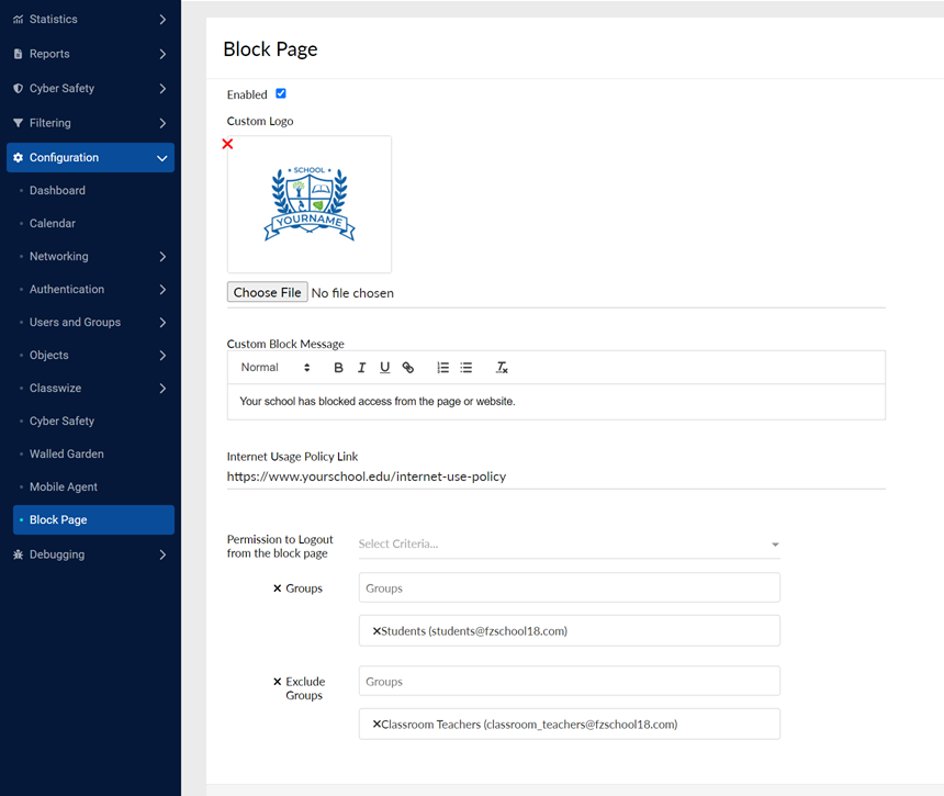 Select Enabled to activate this feature and set up a custom block message.